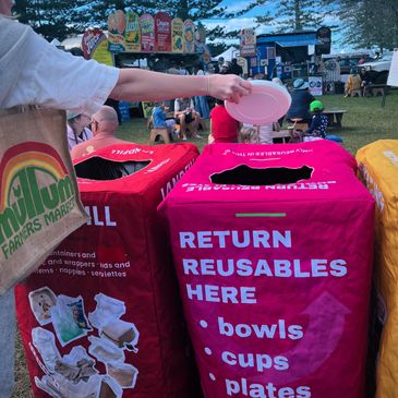 Our business operates on a circular reuse model. By replacing single-use packaging with reusable crockery, cutlery, drinkware and cups, we actively reduce landfill, prevent plastic pollution, and keep waste out of our oceans.